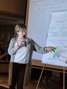 Patricia Wijmans (casemanager dementie Liemosa) vertelde heel duidelijk wat er gebeurt in het brein van mensen die dementie krijgen, welke stadia er zijn en welke gevolgen er zijn in het dagelijks leven. Met als metafoor de boekenkast waar steeds meer boeken uit verdwijnen en met als illustratie diverse filmfragmenten uit “Vergeet niet dat ik van je hou” (gemaakt in opdracht van Alzheimer Nederland) ontstonden er verhelderende gesprekken.